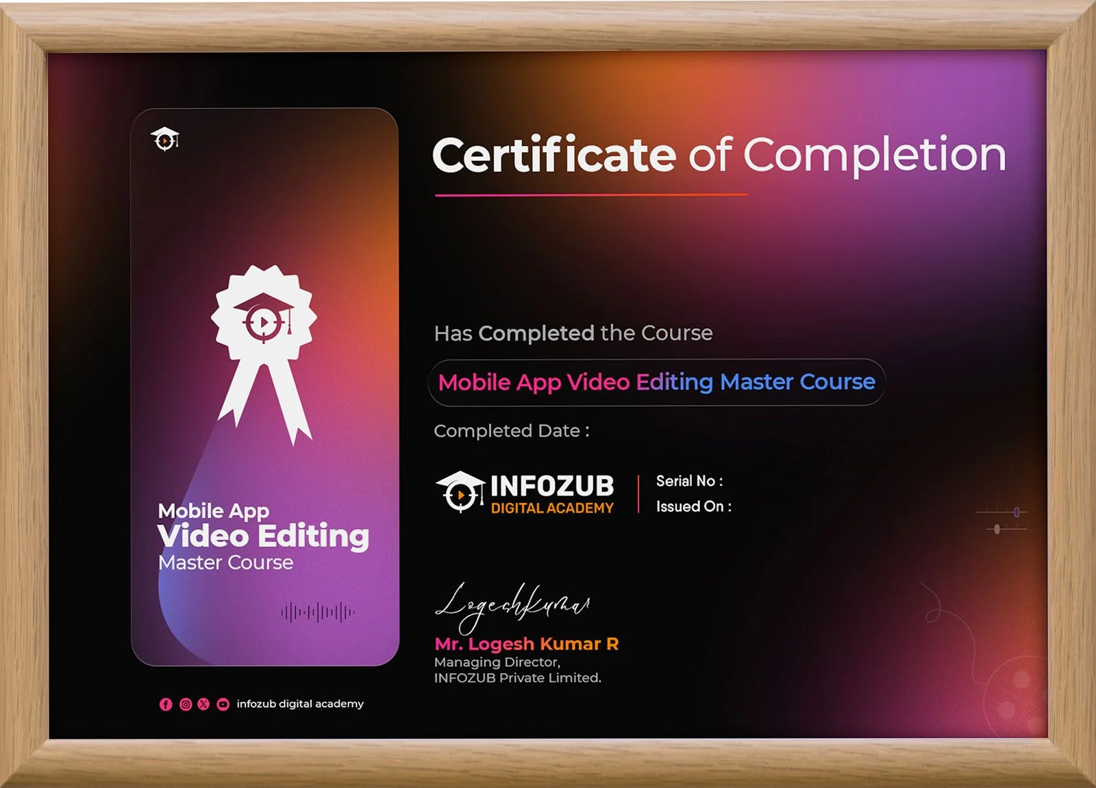 Earn a professional certification with our Mobile App Video Editing Master Course and showcase your video editing expertise. Validate your skills with a globally recognized credential and elevate your career opportunities with Infozub Digital Academy!
